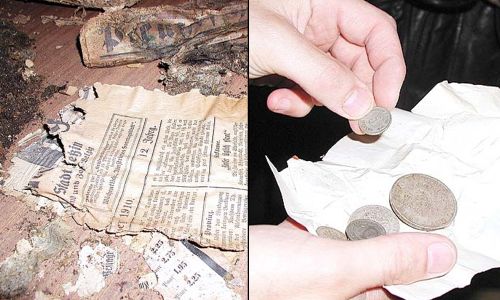 Verrottete Zeitungen von 1910. Münzen aus dem Kirchturmkopf |