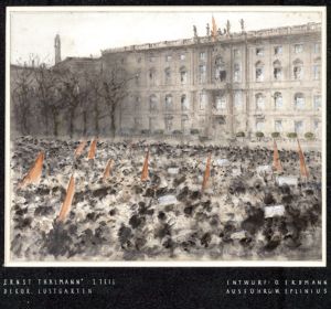 Farbiger Szenen-Entwurf im 1. Teil von Willi Eplinius: Karl Liebknecht spricht vom Balkon der Berliner Stadtschlosses zu den Arbeitern:
