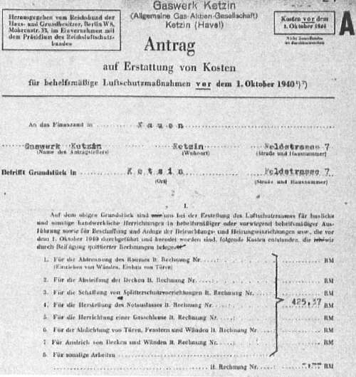 Nauen erhalten, in dem die Erstattung von 425,37 Reichsmark beantragt wurde. Sie waren für die Herrichtung eines Luftschutzraumes in der Gasanstalt ausgegeben worden.