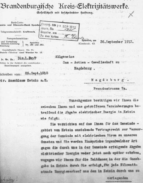 War Stadtgas auch eine für ihre Zeit und ihre Bedürfnisse gut funktionierende und preiswerte Erfindung, so wurde doch das Verlangen der Bevölkerung und der Firmen jener Zeit nach elektrischer Energie immer lauter. Da die Allgemeine Gas-Aktiengesellschaft nun das Recht, selbst elektrische Energie zu erzeugen als Vertragsbestandteil von Goetz und Konrad mit erworben hatte, waren sie es auch, die sich am 25. September 1912, wahrscheinlich auf Druck des Magistrates und der Unternehmer aus Ketzin, mit den Brandenburgischen Kreis-Elektrizitätswerken in Spandau in Verbindung setzten, um die Modalitäten einer Stromversorgung für Ketzin zu klären. Beide schlossen nun eine Vereinbarung, die den Verzicht der Allgemeinen Gas AG beinhaltete, Ketzin mit elektrischer Energie zu versorgen, wofür diese, solange die Gasabgabe in Ketzin erfolgte, eine Abgabe pro Kilowattstunde erhielten, die die Spandauer Werke in das zu errichtende Energienetz einspeisen würden. Diese Abgabe betrug bei abgegebener Energie für Beleuchtungszwecke für Privatkunden 4 Pfennige pro Kilowattstunde, für öffentliche