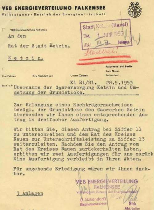 Energieverteilung Falkensee an den Rat der Stadt zwecks Übernahme der Gasversorgung und Übertragung des Grundstücks. Am 3. Juli erklärt der Stadtrat seine Zustimmung zur Übertragung der Rechtsträgerschaft an die Verwaltung volkseigener Betriebe in Berlin. Wenn auch die Übernahme schnell vor sich ging, hielt der Schriftverkehr um die Zustimmung des Rates des Kreises Nauen noch bis zum April des Folgejahres an. Nachdem Gustav Stanzeit vom VEB Energieverteilung Falkensee als Betriebsleiter abgelöst wurde übernahm Herr Otto Zander am 10. Februar 1953 die Leitung des Betriebes.
