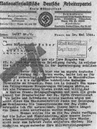 Der Vorfall schlug solche Wellen, dass der Bürgermeister am 11. Mai einen Brief des Oberbereichsleiters der NSDAP des Kreises Havelland auf den Tisch bekam. Seine Schilderungen der Probleme der Gasversorgung bewog den Kreisleiter die Drosselung des Gasverbrauchs der Wäscherei Jesko anzuweisen. Er schrieb: „…Wenn ich in Zukunft von unseren Volksgenossen Einsparungen verlangen müsste, so ist als Vorraussetzung hierzu recht und billig, dass die Herren franz. Kriegsgefangenen und auch die große Anzahl der Fremdarbeiter der Fa. Späth freundlichst ihre Leib- und Bettwäsche allein waschen mögen und nicht diese dem Wäschereibetrieb Jesko zur Reinigung überlassen. … Ebenso wollen Sie an die Fa. Jesko verfügen, dass die L.S.- und Flakeinheiten, also unsere deutschen Wehrmachtsangehörigen, ebenfalls ihre Wäsche nicht mehr zum Betrieb Jesko abliefern dürfen.