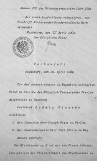 Hierzu waren der Ingenieur Joseph Goetz und der Generaldirektor der Aktiengesellschaft Generaldirektor Carl Florin persönlich vor Justizrat Ludwig Gieseke in Magdeburg erschienen. Seit dem 1. Januar dieses Jahres wirtschaftete die Gasanstalt schon auf Rechnung der neuen Besitzerin aber erst am 25. April 1904 wurden die Verträge unterzeichnet, die den Handel rechtskräftig machten. Da die Käuferin außer dem Gaswerk und der Immobilie, den Maschinen, Werkzeugen, Kohlen und allem fassbaren auch die